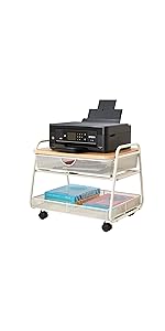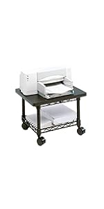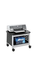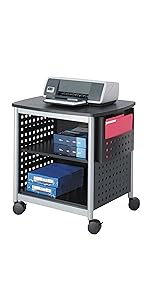 The Desk Side Wire Machine Stand is a black mobile printer cart with steel frame and powder coat finish for durability. The device stand offers two sturdy shelves for storage of supplies. The mobile cart rests on four casters (two locking).
